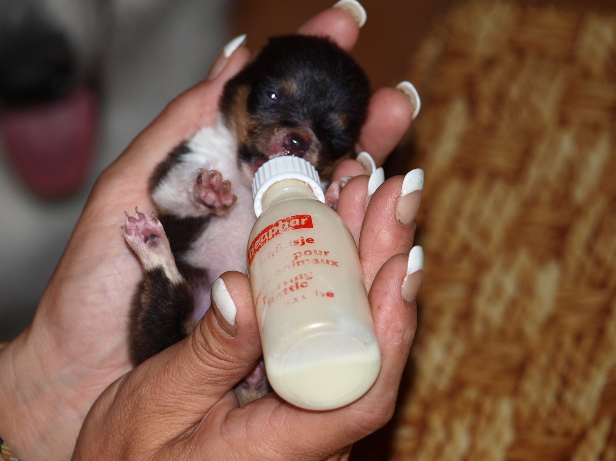 Roxinka to bohužel tentokrát nějak nezvládala tak jsme museli odjet na císařský řez.Jedna princezna se nám špatně otočila tak to bylo příčinou že Roxi nemohla odrodit.Bohužel druhýden tato malá odešla za duhový most a co čert nechtěl i druhá v pořadí holčička odešla za ní za týden.Zůstala nám ta nejmenší princeznička....je fantastická a bojovnice.I když naše Roxi začala bez příčiny chřadnout ,začali jsme krmit z lahvičky a naše kuřátko se má čile k světu.Tady krmíme ...